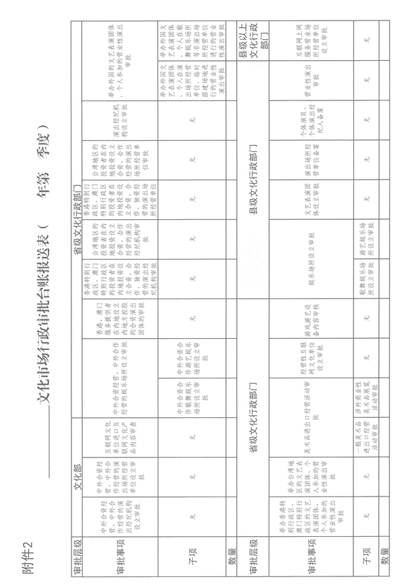 申请人递交申请材料→区县文化局市场处出具是否受理书面凭证→责任人对材料进行审查并提出初步意见(必要时须组织听证、公示)→市场处负责人初审→市场处分管领导审核单位→厅领导审定→报文化部审批→网上公示审批结果 -> 审批结束归档